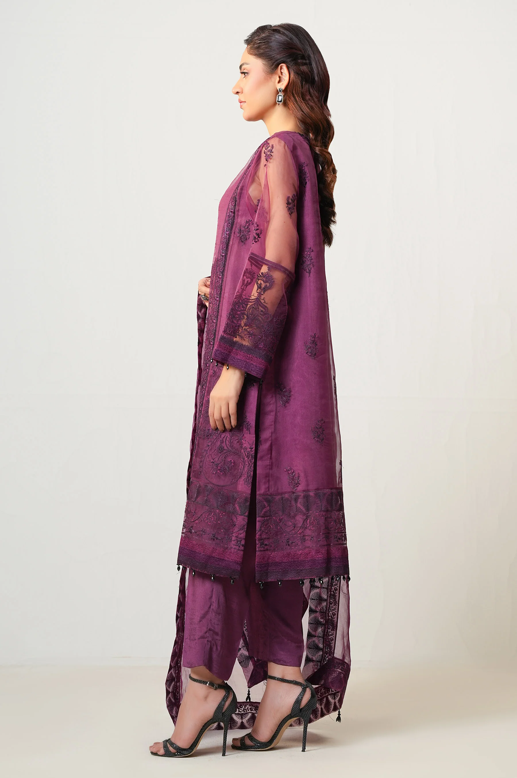 Enchant your wardrobe with the richness of Aura Plum, a luxurious embroidered 3-piece suit. The organza fabric features beautifully detailed panels and borders for a graceful design. Thoughtful hand embellishments enhance its appeal for formal events. Chic raw silk trouser ensure comfort without compromising elegance. Elevate your look for unforgettable celebrations.