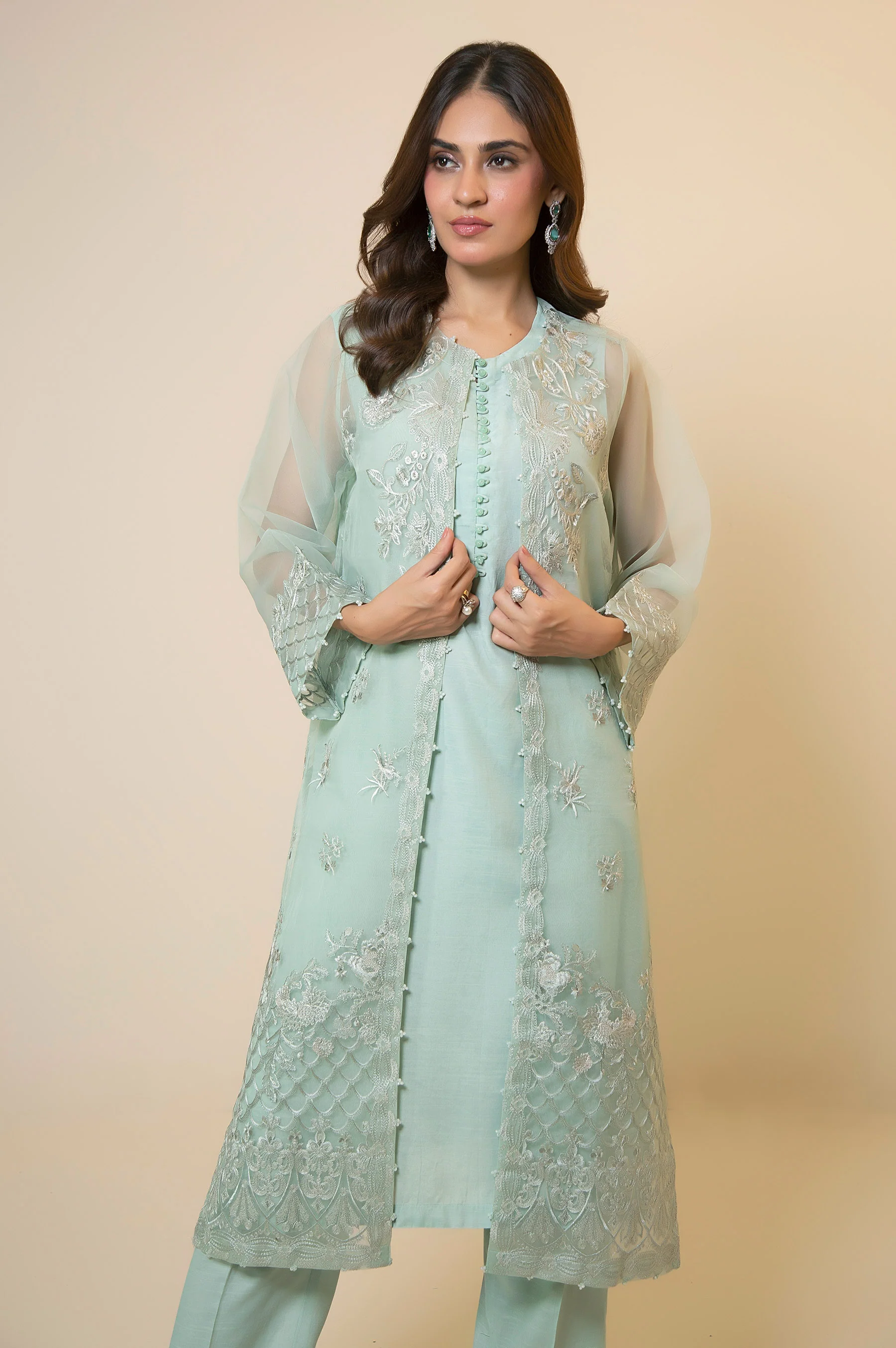 Mint Radiance is the embodiment of soft elegance, bringing a touch of sophistication to your semi-formal wardrobe. This enchanting mint green ensemble is crafted from luxurious organza, adorned with intricate embroidery on the right and left front panels, back, and sleeves. The embroidered kali adds an extra layer of refinement, while the plain sleeves are enhanced by embroidered borders. A stunning embroidered dupatta with ornate pallu complements the suit, making it perfect for special occasions.