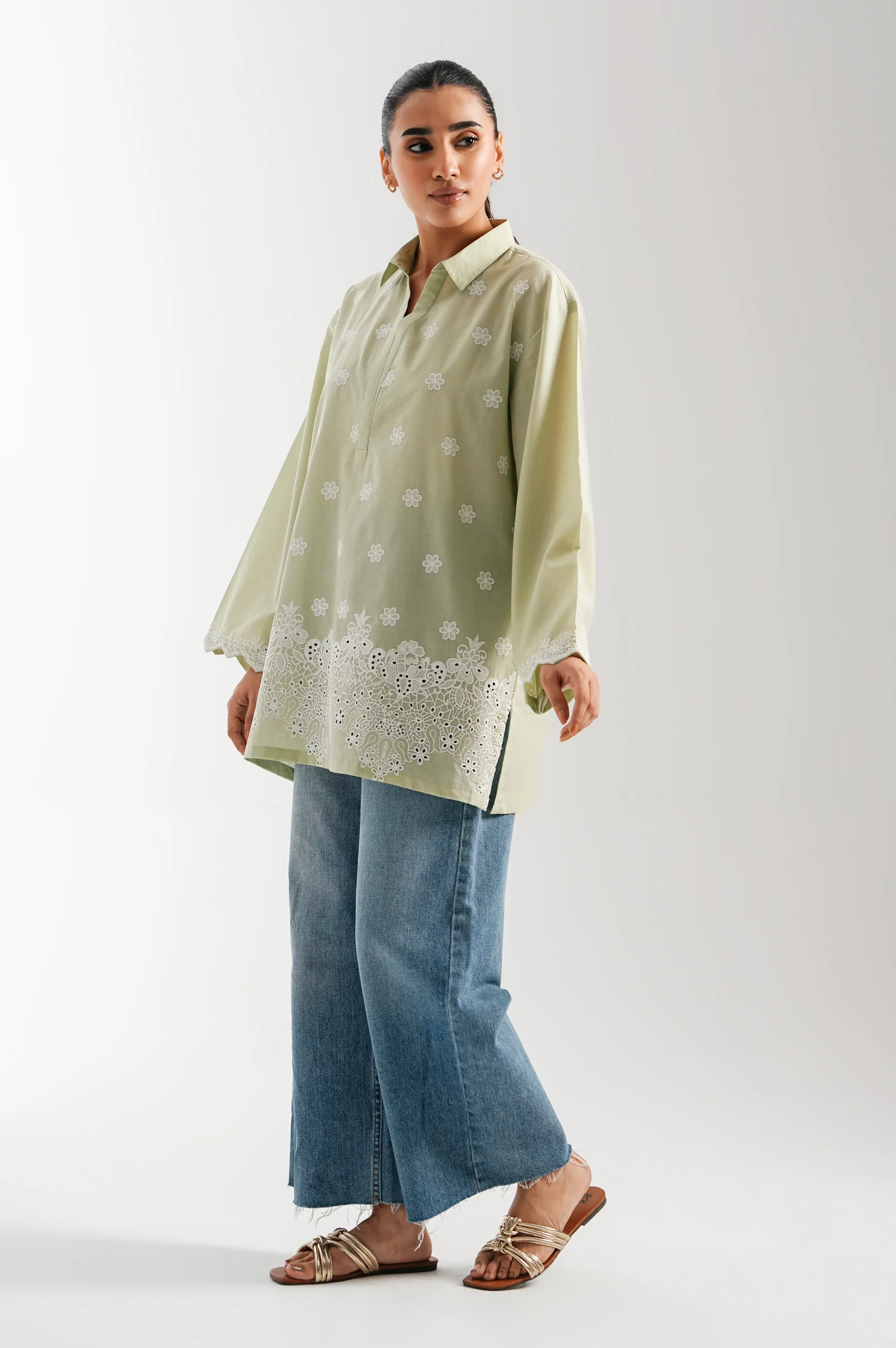 Stay stylish and comfy in this Deep Pista embroidered Chikankari lawn top. It’s a great ready to wear choice for women. Crafted from breathable Chikankari lawn fabric, it provides comfort all day and a stylish, elegant appearance. The top has a flattering A-line shape, a short length, a smart shirt collar, and bell sleeves for a graceful look. Its detailed embroidery boosts the overall elegance. This makes it perfect for casual outings, relaxed gatherings, or everyday wear.