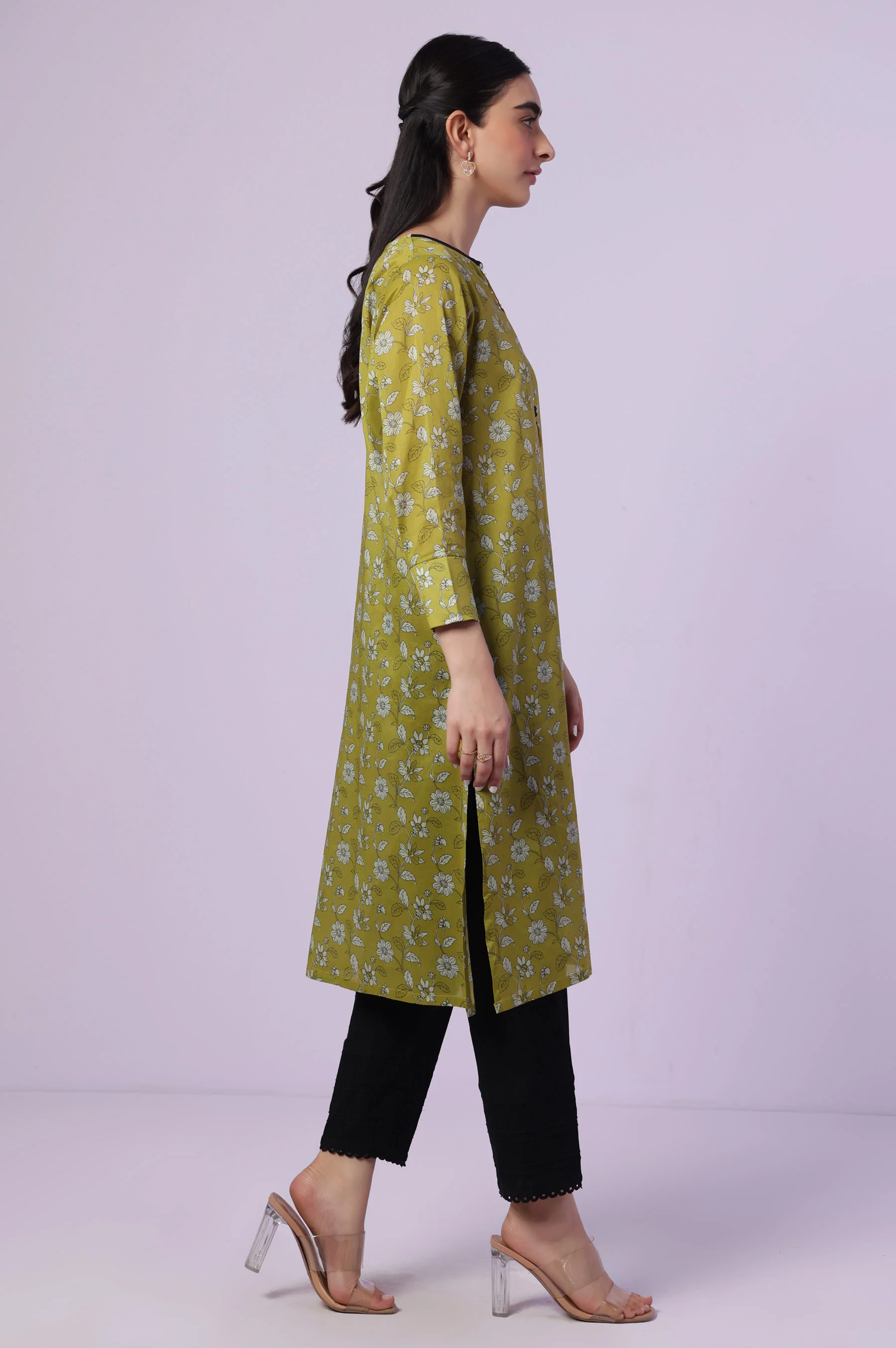 Elevate your casual style with this stitched 1 piece printed lawn shirt in lime green. This regular fit shirt features an English floral print with colorful detailing and stitching accents. This shirt offers a relaxed yet stylish look.