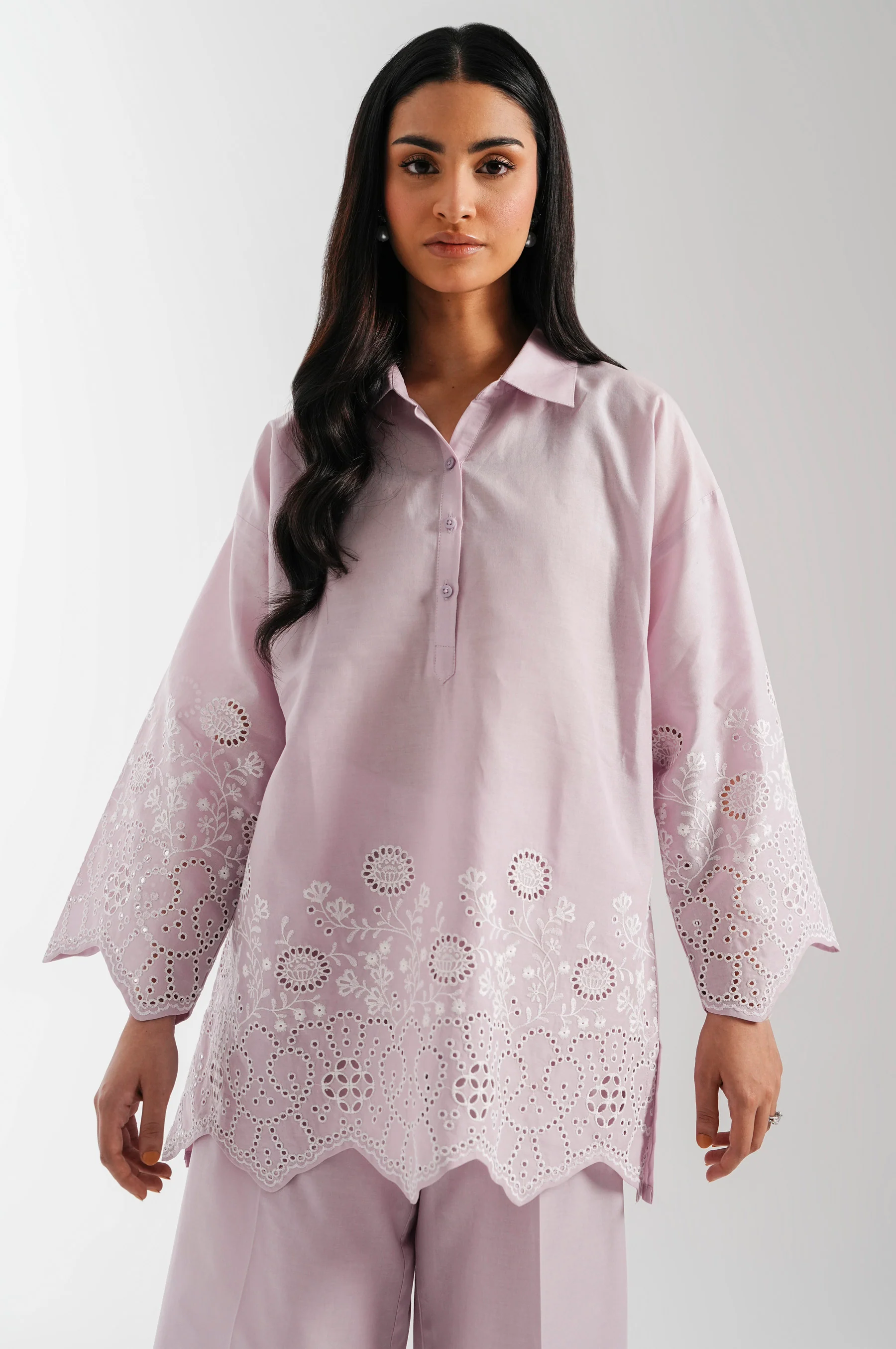 Step into summer elegance with this 2-piece lilac chikankari suit. Modern embroidery on the top and bottom enhances its graceful appeal. The lightweight lawn fabric makes it a perfect choice for warm days. Paired with culottes to add a trendy and effortless touch. An ideal pick for casual chic wear.
