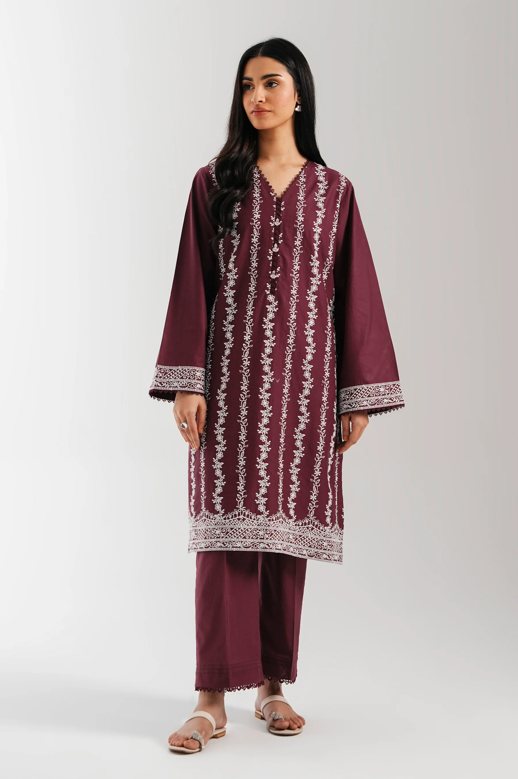 Make a subtle statement in this plum 2-piece Chikankari lawn suit, designed with elegant embroidery and a flattering V-neckline. The straight calf-length shirt with bell sleeves and A-line hem adds refined charm. It’s styled with culottes for a modern twist. A perfect pick for casual wear with a touch of sophistication.