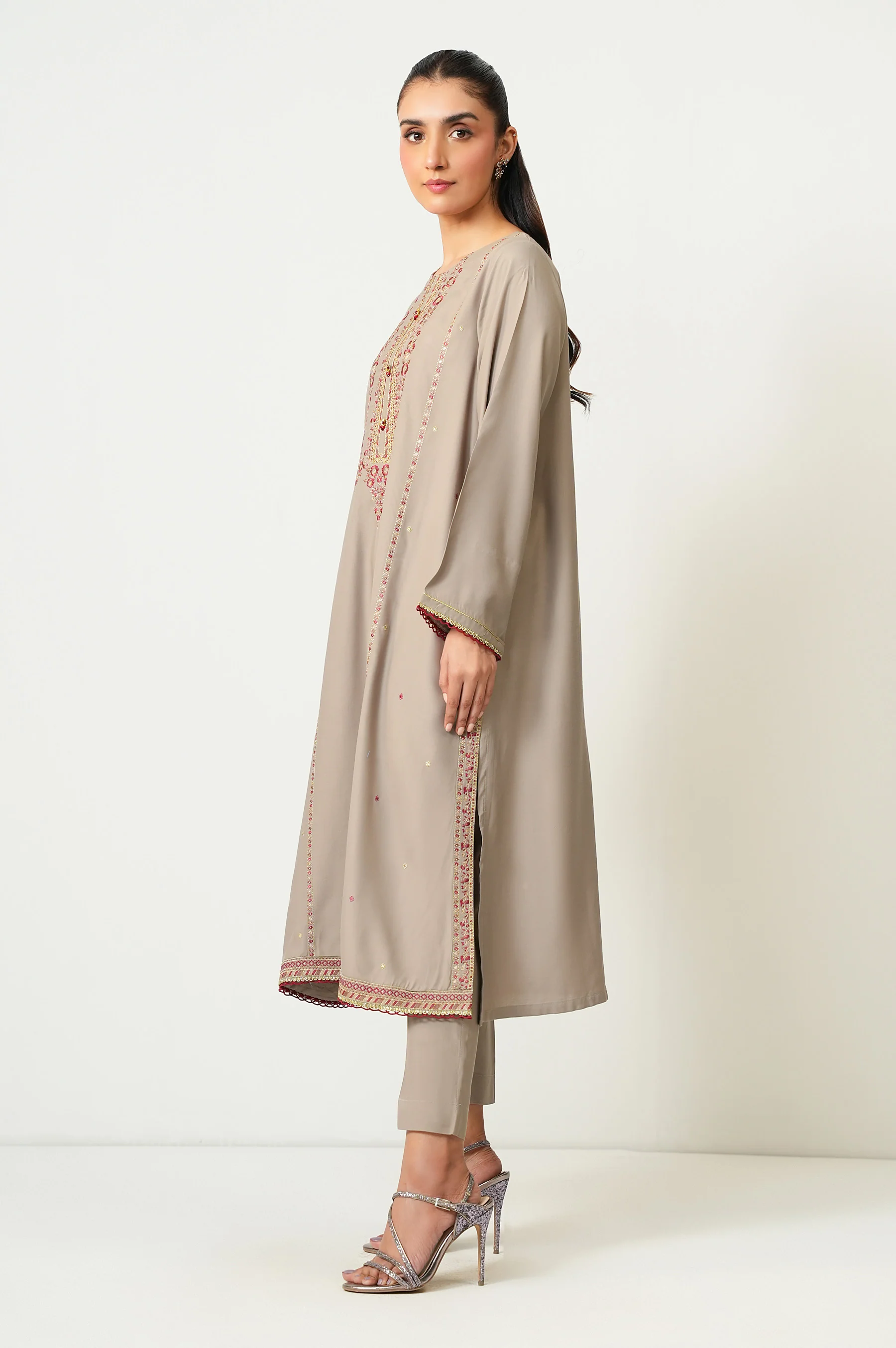 Make a statement with this elegant slate grey oak silk outfit. This knee-length straight shirt features intricate floral embroidery on the round organza neckline and full sleeves. Paired with sleek cigarette pants, it’s a perfect choice for party wear. The luxurious silk fabric ensures a refined and polished look, offering both comfort and sophistication.