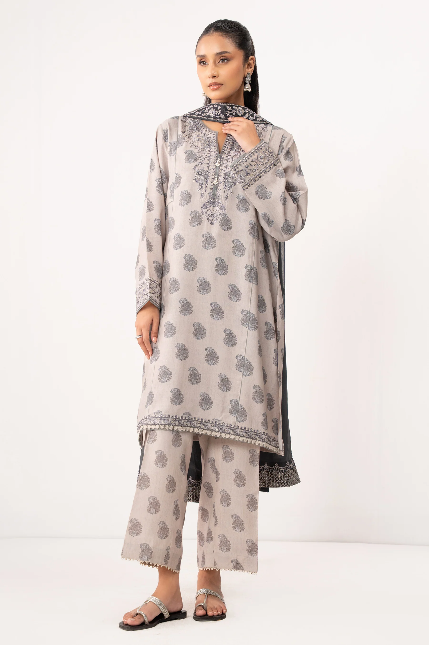 Timeless and versatile, this light grey 3-piece raw silk suit features detailed embroidery and digital prints that bring subtle sophistication. The calf-length A-line shirt is designed with a round neckline and flowing bell sleeves. A deep grey chiffon dupatta with dyed embroidery complements the soft base, while loose pants offer a relaxed fit. Ideal for casual gatherings with a hint of polish.