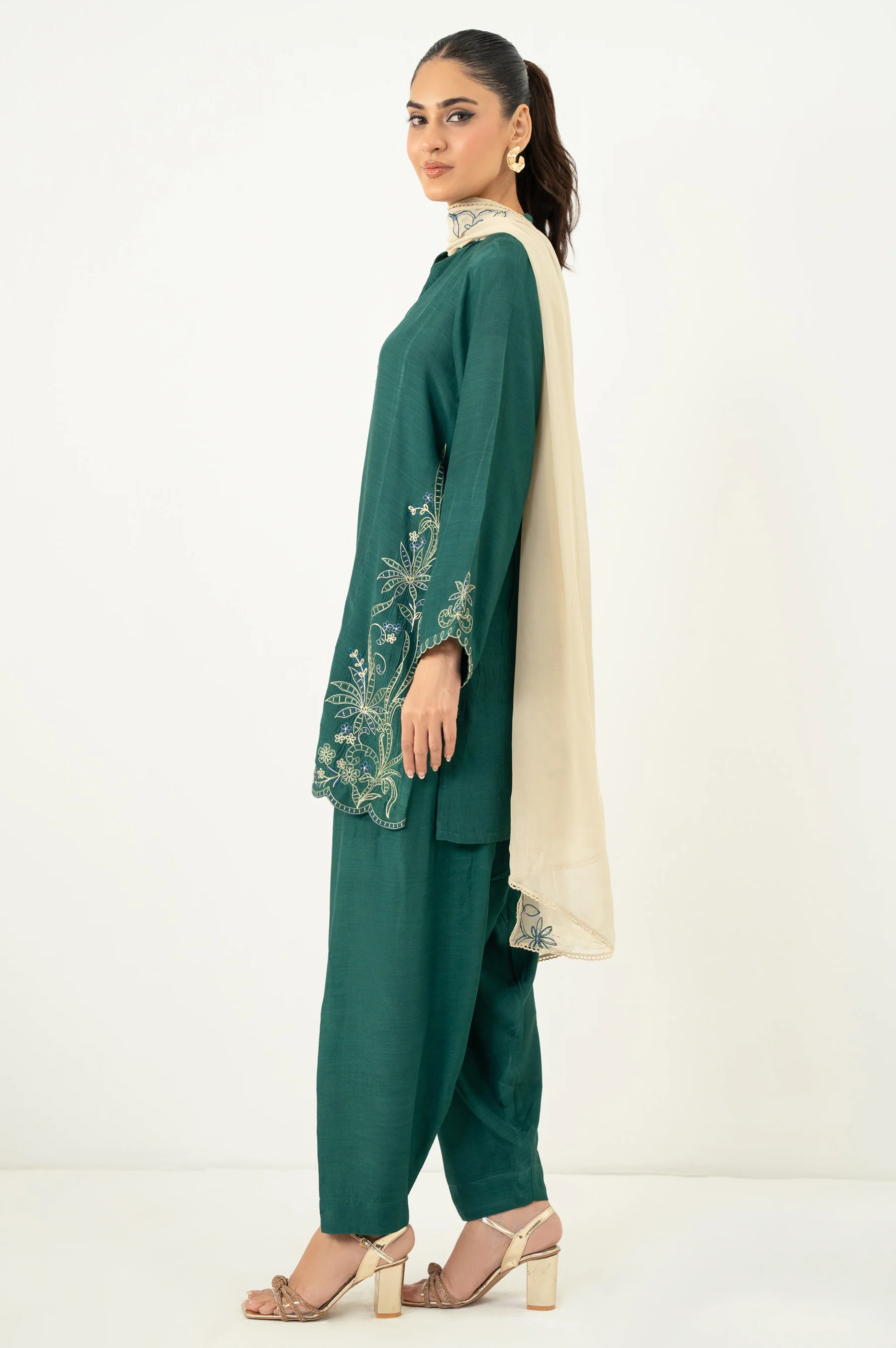 Turn heads with this bold and beautiful stitched 3-piece suit in rich forest green embroidered raw silk. The dyed raw silk shirt is paired with a traditional shalwar for a timeless appeal, exuding ethnic style. Paired with an embroidered chiffon dupatta to add an ethereal touch to the overall look. Perfect for party wear, radiating elegance and charm.