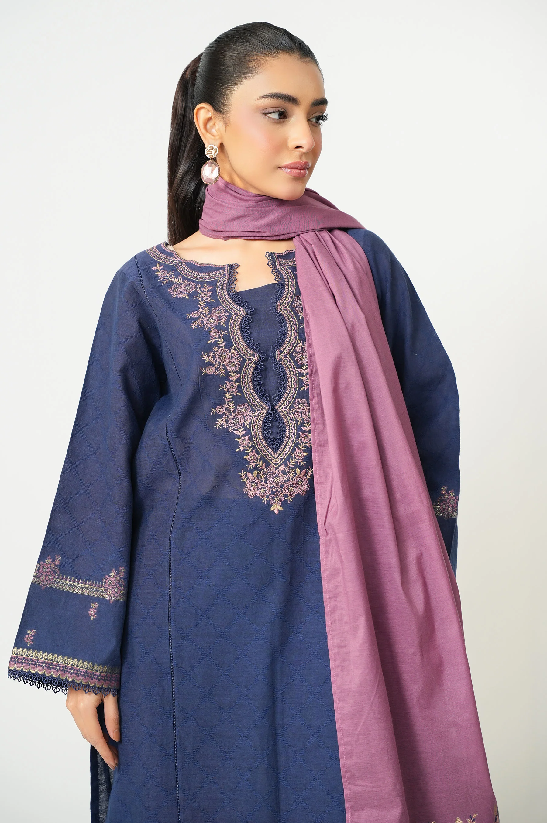 Intricately crafted, this outfit is designed to make you feel regal with its details. Contrasting colored neckline embroidery on a self patterned jacquard shirt, fully composed jacquard bottom and a beautiful jacquard dupatta. This outfit is adorned with laces to complete the look.