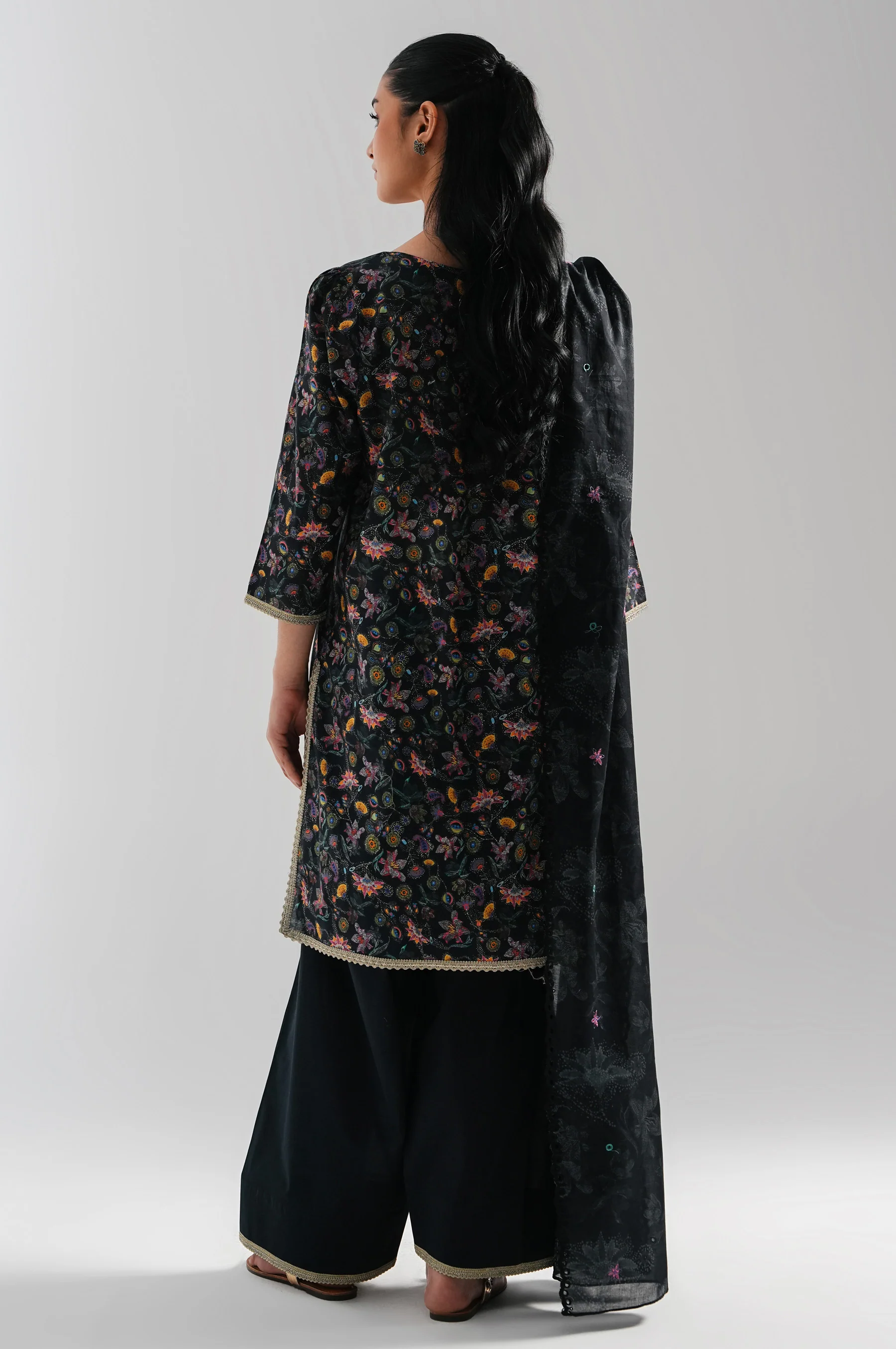 Minimalistic and modern, this black 3-piece lawn suit is all about subtle style. The digitally printed shirt offers a sleek look, complemented by a sheer chiffon dupatta and a comfortable cambric trouser. This suit is the perfect staple for women who appreciate a clean, versatile wardrobe with day-to-night appeal.