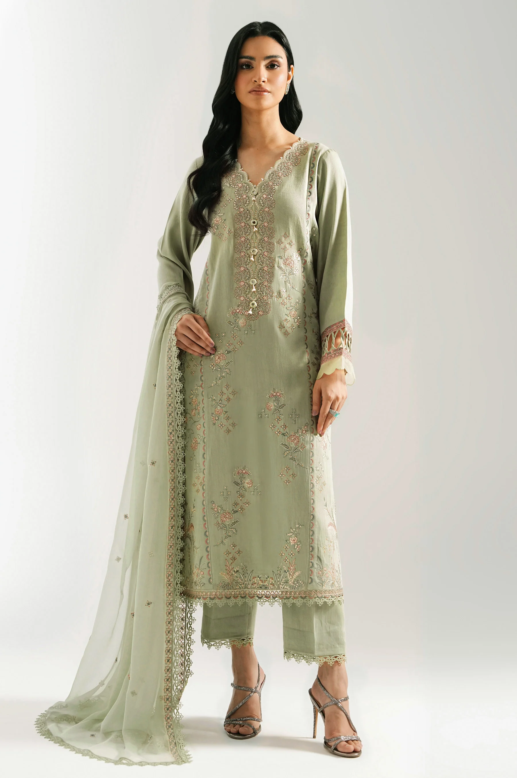 Embody grace and sophistication with this embroidered cotton satin 3-piece suit in pistachio green. The defining feature of this suit is the embroidered lacing for sleeves and hemline, making you look exquisite