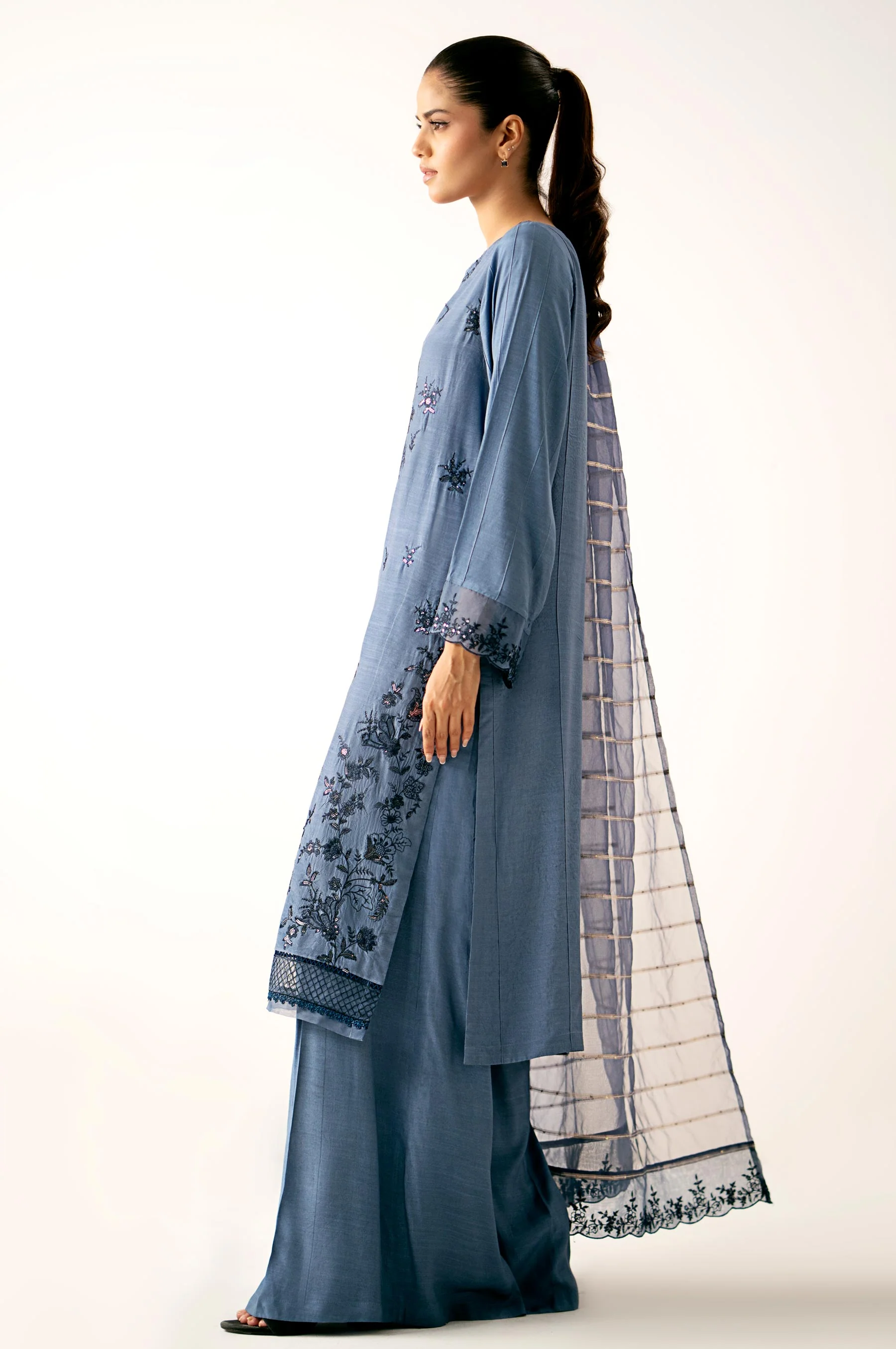 An exquisite 3-piece unstitched suit in aegean blue with an embroidered raw silk front, dyed back and sleeves, and detailed embroidered borders for the dupatta pallu, daman, and sleeves. The suit includes a dyed raw silk bottom and an organza stripes dupatta, showcasing botanical designs, perfect for party wear.
