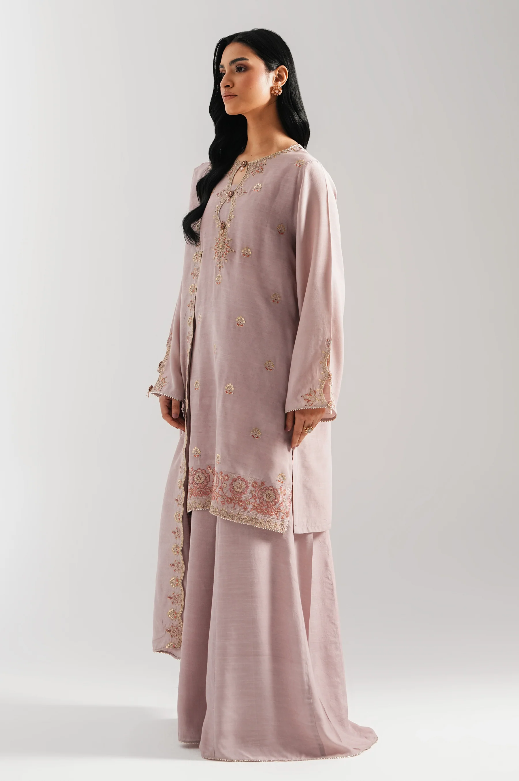 This lilac 3-piece suit, made from high-quality embroidered raw silk, is the life of the party. The intricate designs on the front, sleeves, neckline, and the dupatta are second to none, and you will feel the joy as you wear it